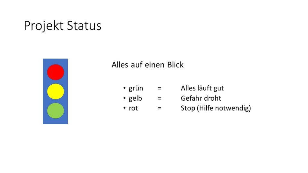 Wo steht man in einem Projekt? Um dies herauszufinden, ist der aktuelle Status mit dem Plan abzugleichen. Manager möchten dabei immer auf einen Blick sehen, wie es um ein Vorhaben steht. Dies kann in Form einer Ampelfarbe erfolgen. Ist die Ampel grün, dann ist ein Projekt auf einem guten Weg, ist sie gelb, gibt es Schwierigkeiten, die aber das Projektteam selbst beheben können sollte. Bei Rot dagegen ist das Projektteam nicht mehr alleine in der Lage, das Projektergebnis in Zeit und Budget zu erreichen. Hilfe von außen ist notwendig.