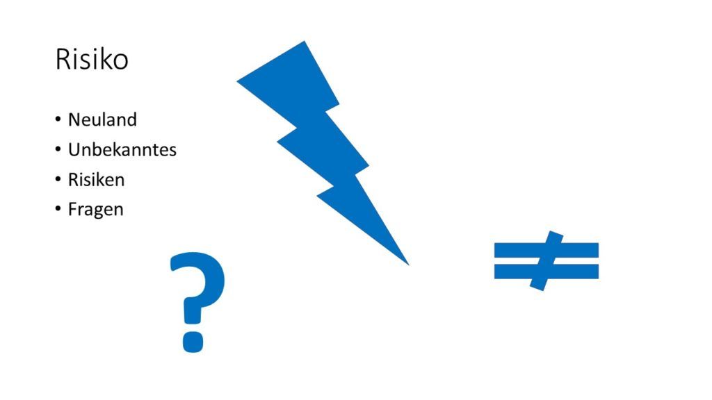 Der Blitz steht für die Risiken, die mit Projekten verbunden sind. Risiken sind durch eine Eintrittswahrscheinlichkeit und eine Schadenshöhe zu charakterisieren. Sie können auf allen Themengebieten existieren, sich verändern und sind immer eine Bedrohung, die es zu beobachten gilt. Risiken können durch Maßnahmen beseitigt, abgeschwächt, umgangen, versichert oder auch abgewälzt werden. Risikomanagement sollte daher ein integraler Bestandteil des Projektmanagements sein. Das Gegenteil von Risiken sind Chancen. Diese können in gleicher Weise betrachtet und in der Projektsteuerung einbezogen werden.