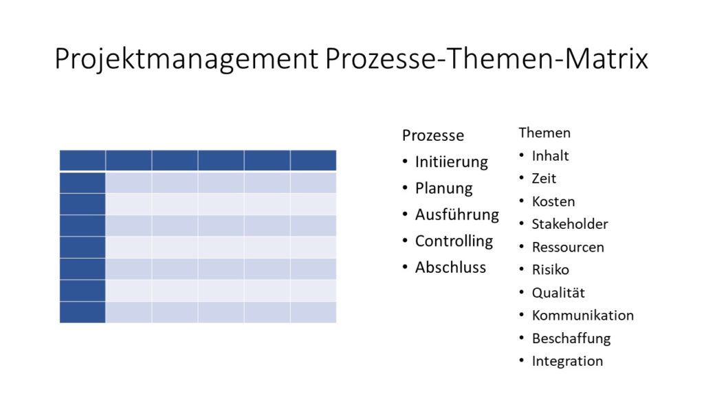 Will man das Thema Projektmanagement strukturieren, so wird dies üblicherweise über Prozesse und Themengebiete erreicht, die die beiden Achsen einer Matrix aufspannen. In der ISO Norm 21500 und im weltweit führenden PM Standard von PMI stellt die Prozess-Themen-Matrix den Gestaltungsraum des Projektmanagements dar. Dabei bilden die Prozessgruppen Initialisierung, Planung, Durchführung, Kontrolle und Abschluss die eine Achse. Sie beinhalten weitgehend den oben beschriebenen Deming Kreislauf. Die zweite Achse wird durch die Themen Inhalt, Zeit, Kosten, Risiken, Qualität, Ressourcen, Stakeholder, Kommunikation, Beschaffung und Integration definiert. Diese Themen sind die Wissensgebiete, die vorrangig im Projektmanagement zu beachten sind. In der Kompetenz Übersicht des IPMA Standards werden diese 10 Themen in über 40 Einzelthemen aufgegliedert. Es zeigt die Vielfalt der Einflüsse und Handlungsoptionen des Projektmanagements. Verschiedene Wege durch die Matrix können genutzt werden, um das gesamte Projektmanagement zu studieren.