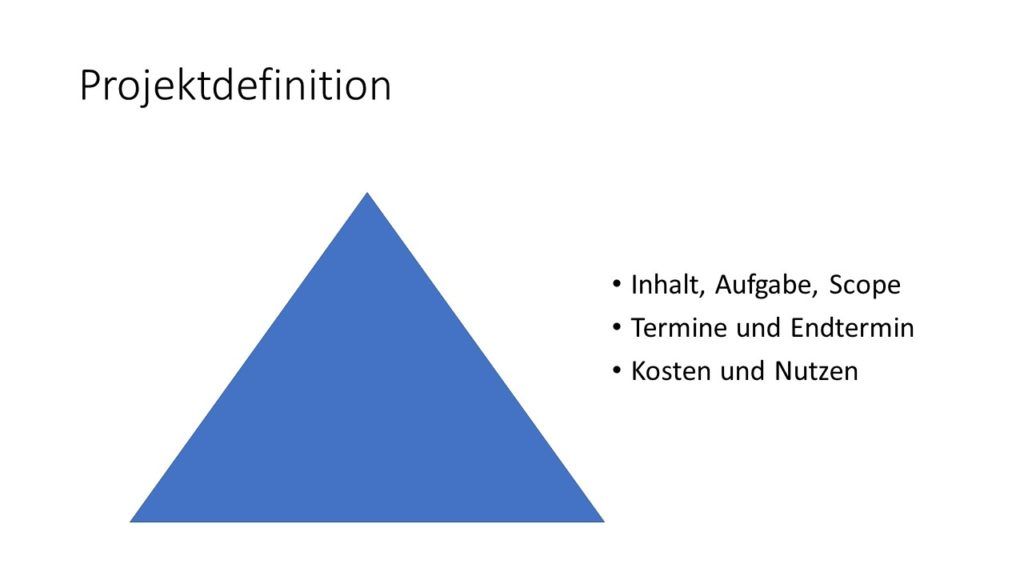 Das magische Dreieck beschreibt die drei wesentlichen Determinanten eines Projektes, die da sind: Inhalt, Termin und Kosten. Ein Projekt hat einen Inhalt, der im englischen Scope genannt wird. Dies steht für die Aufgabenstellung, das Problem und das Projektergebnis, das es zu erarbeiten gilt. Dazu sind die Rahmenbedingungen in erster Linie eine zeitliche und budgetmäßige Begrenzung. Ein Projekt sollte an einem definierten Zeitpunkt beendet werden. Und es steht ein bestimmtes Budget zur Verfügung. Die Aufgabe des Projektmanagements ist nun, das Projekt so zu steuern, dass das bestmögliche Ergebnis in der vorgegebenen Zeit und mit vorgegebenem Geld erreicht wird. Sind diese 3 Eckpunkte eines Projektes am Anfang klar definiert, ist bereits viel gewonnen. Ein gutes Projekt beginnt am Anfang mit einem klaren Projektauftrag, der vor allem durch die drei genannten Punkte als Ecken eines Dreiecks festlegt wird.