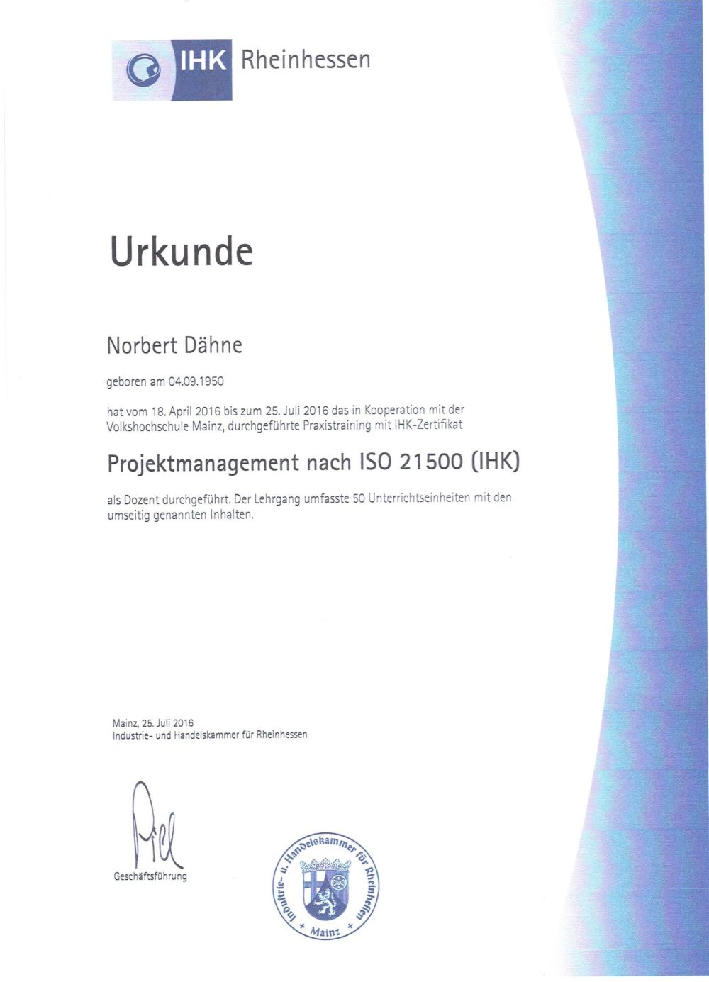 Unternehmen können Ihr Projektmanagement System an ISO 21500 ausrichten, auditieren und zertifizieren lassen. Die Basis hierzu ist ein Projektmanagement, dass den Leitlinien der ISO 21500 folgt. Die unternehmensspezifischen Regelungen hierzu sind in einem Projektmanagement Handbuch zu beschreiben. Projekte werden nach ISO 21500 und dem eigenen PM Handbuch durchgeführt. Die Führungskräfte und Projektmitarbeiter sind entsprechend informiert bzw. geschult. Mehr dazu finden Sie hier – bitte klicken!